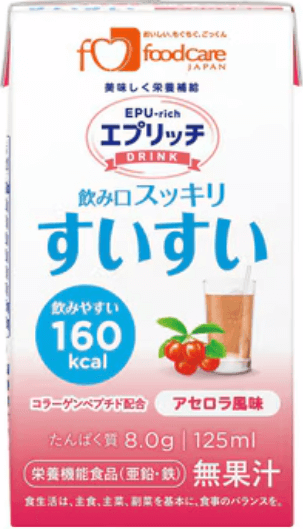 少量でエネルギーを簡単に摂取できる液体のONSとして、アイソカル100(200kcal/100m)、すいすい(160kcal/125m)が利用できます。水分制限中であるとか、嚥下に問題がある場合は、液体よりはゼリー(ハイカロリーゼリー 150kcal/1個)やプリン(エネプリン110kcal/1個)を勧めます。