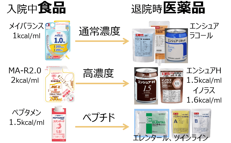 - 経腸栄養剤は、入院中は食品でオーダーすると食事代を請求できるので病院は経営上助かり、外来では医薬品をオーダーしてもらえると保険が利くので患者さんが助かります。
