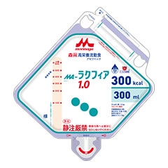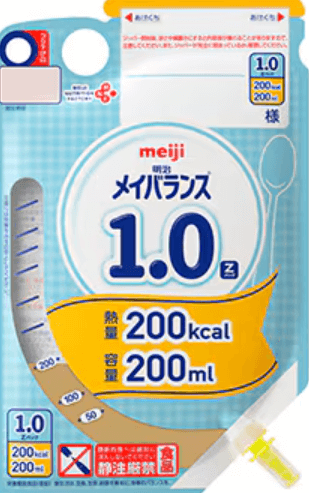 当院では、1kcal/mlの濃度は容量200mlのメイバランス1.0、300mlのラクフィアを、2kcal/mlの濃度は容量200mlのMA-R2.0を採用しています。
