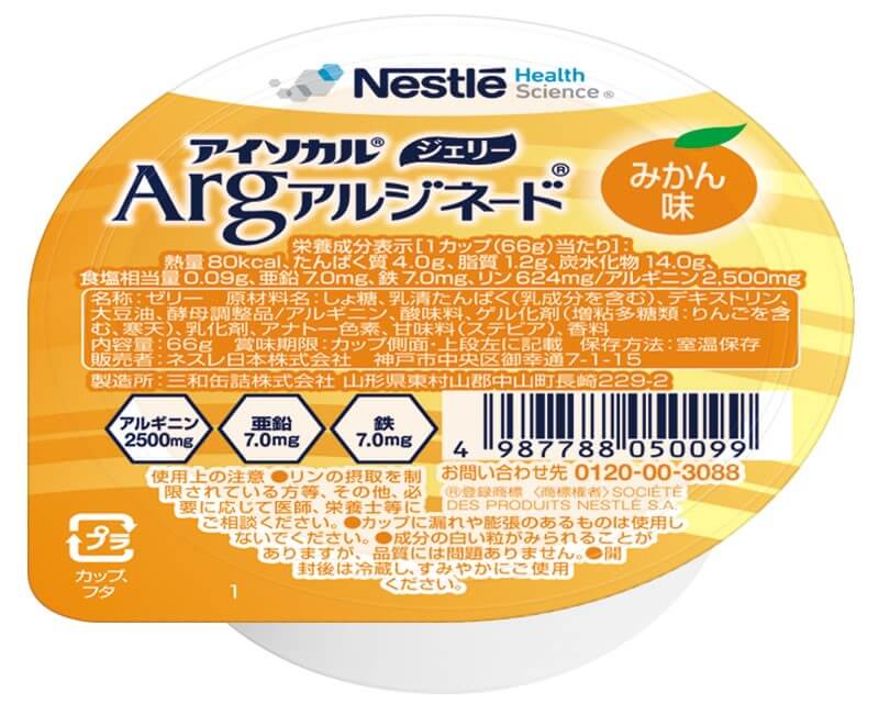 1袋を240~300mlの水に溶解する。80kcal。創傷治癒に重要な成分を多く含む。L-Arg7000mg、L-Glu7000mg、HMB1200mg。オレンジ味。