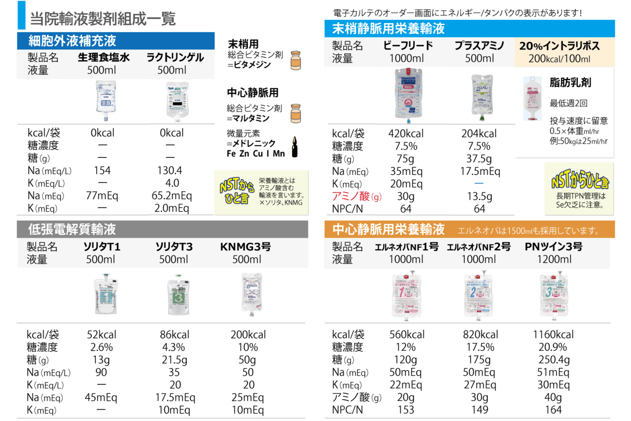 坂総合病院採用|輸液製剤組成一覧 2021 10/24 臨床栄養のオキテ 静脈栄養 2021年10月24日2025年11月28日 表示が一見小さ過ぎですが、クリックで拡大します。ご活用ください。 坂総合病院採用輸液製剤組成一覧 nutrition-support-at-a-glance on… 各輸液製剤の組成 | Notion Hosted by Notion Sites — The easiest way to get a website up and running. 臨床栄養のオキテ 静脈栄養 栄養ちびガイド よかったらシェアしてね! URLをコピーしました! URLをコピーしました! 坂総合病院採用|経腸栄養剤一覧 誰でもわかる経腸栄養剤の選びかた 関連記事 嚥下訓練中のかたにはどんな食事オーダーを出すべき?|坂総合病院の場合 2021年12月11日 カリウムフリー輸液を組み立てよう! 2021年11月20日 坂総合病院採用|経腸栄養剤一覧 2021年10月24日 初代 栄養ちびガイド 2016年9月28日